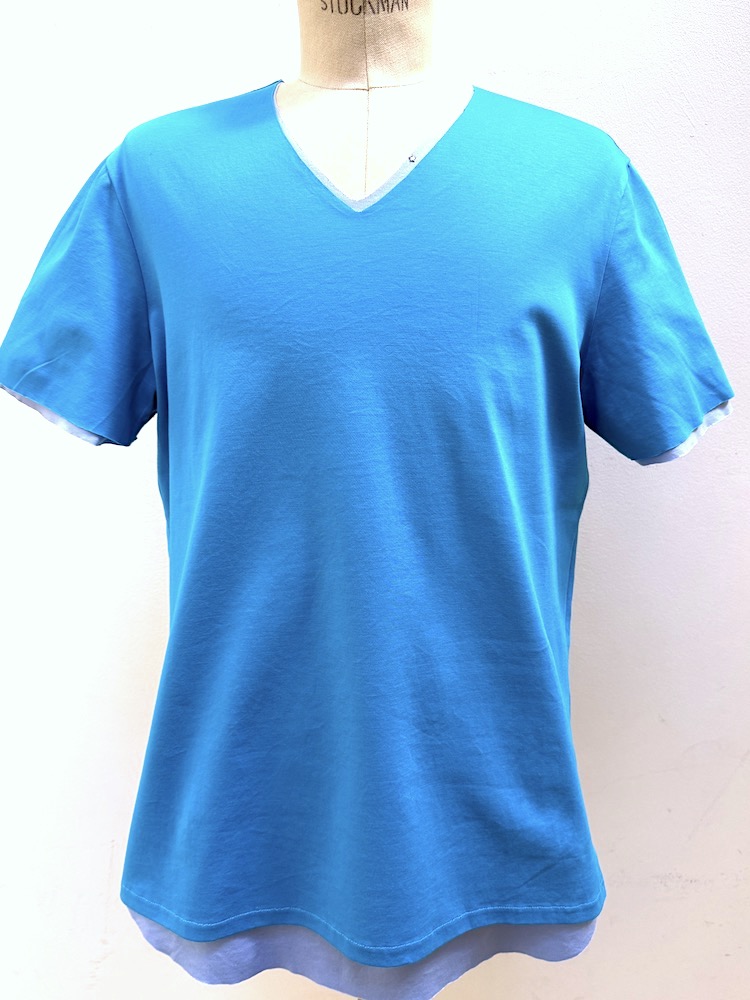 MT3079【5/上旬発送】LYOCELL/C JERSEY FAKE LAYERED V-NECK T-SHIRT #CORAL BLUE x TURQUOISE