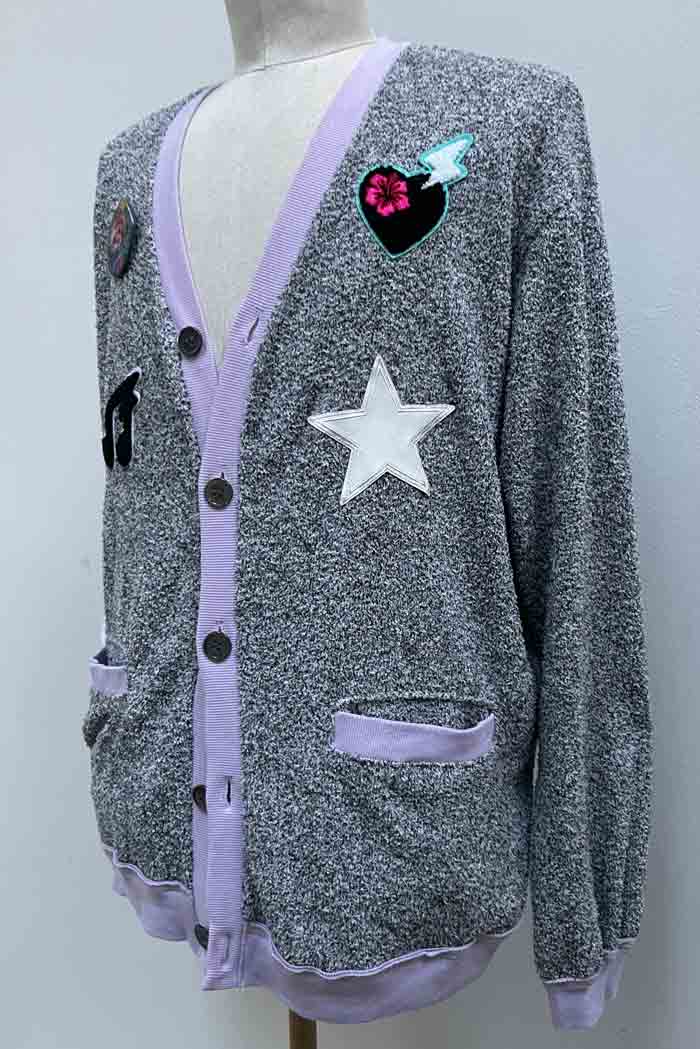 通年着用出来て軽量で肌触りの良い、モコモコパイルニットのオーバーサイズ・レタードカーディガン。