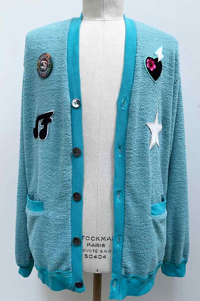 通年着用出来て軽量で肌触りの良い、モコモコパイルニットのオーバーサイズ・レタードカーディガン。