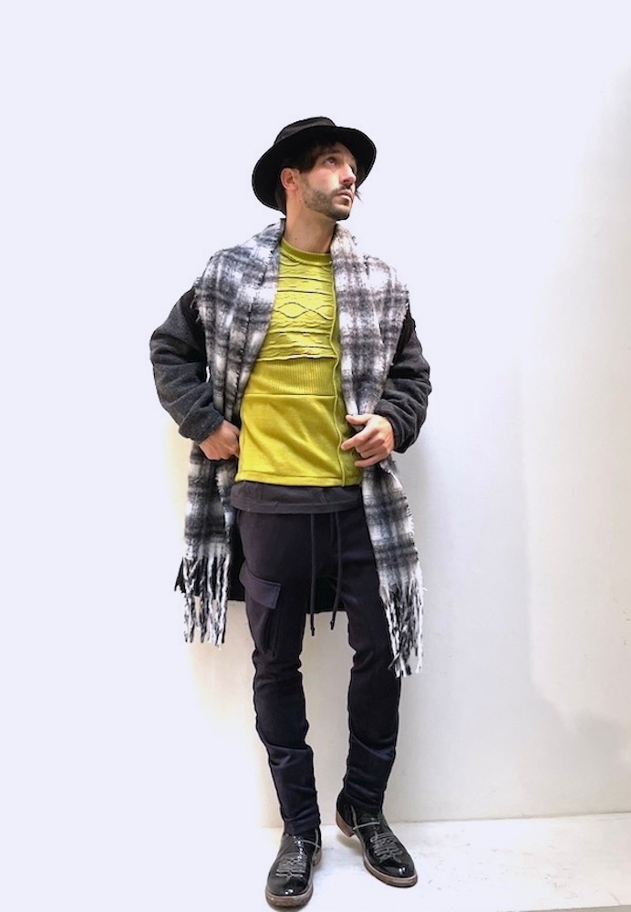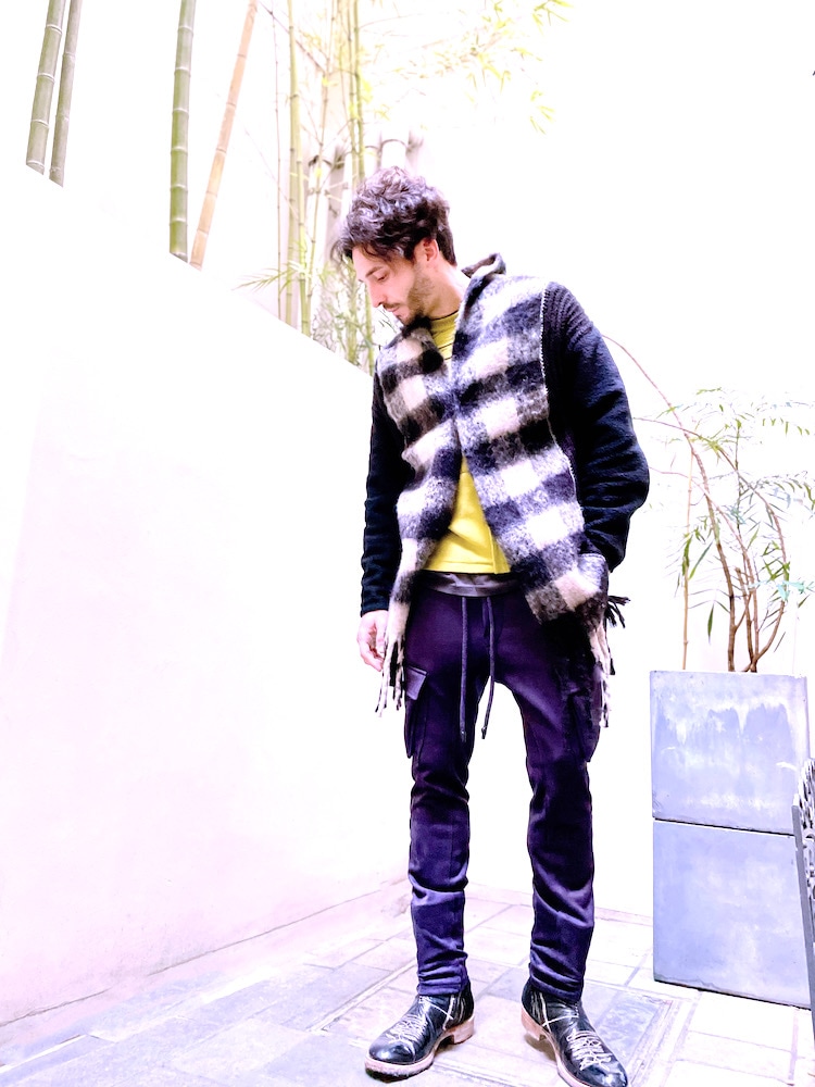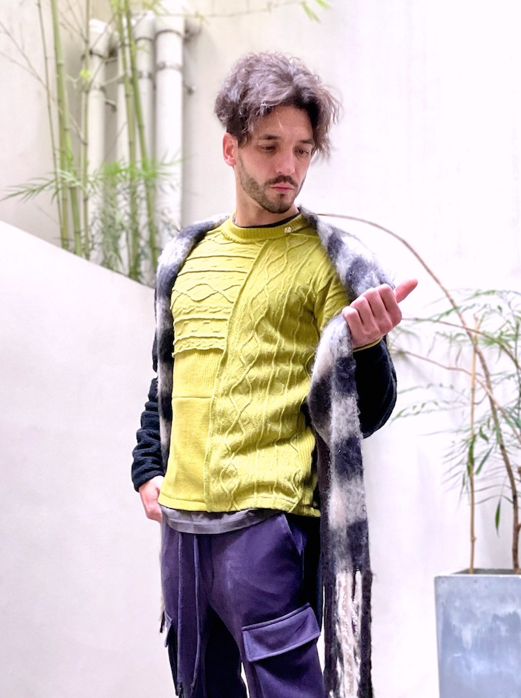 フランシスト・モークスらしいギミックが効いた絶妙なクレイジーパターンで、3素材をミックスしたニット。