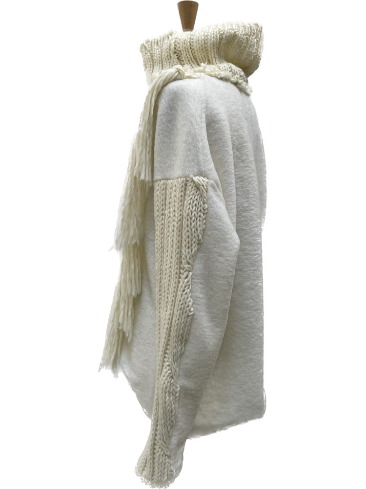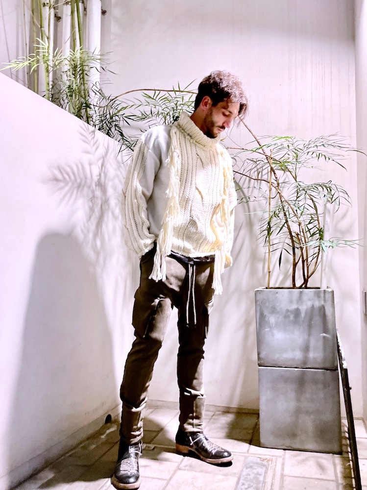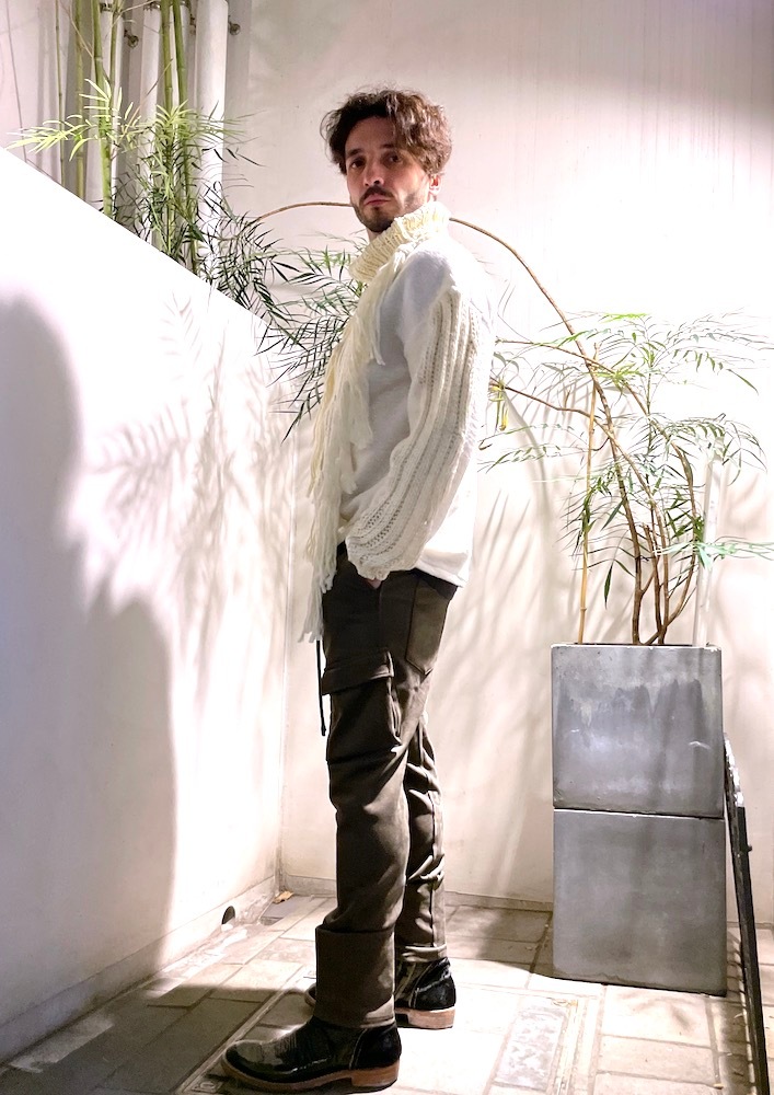 「MK3050 BIG CABLE KNIT VOLUME NECK PULL OVER #01 WHITE」は、ボリューム感のあるネックデザインが特徴で、寒い季節でもスタイリッシュに決まります。その大きなケーブル編みは、温もりを保ちながらも洗練された印象を与えます。