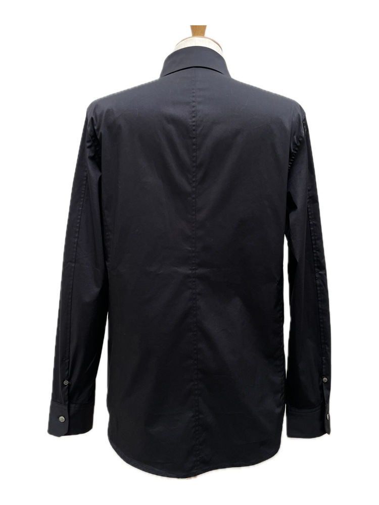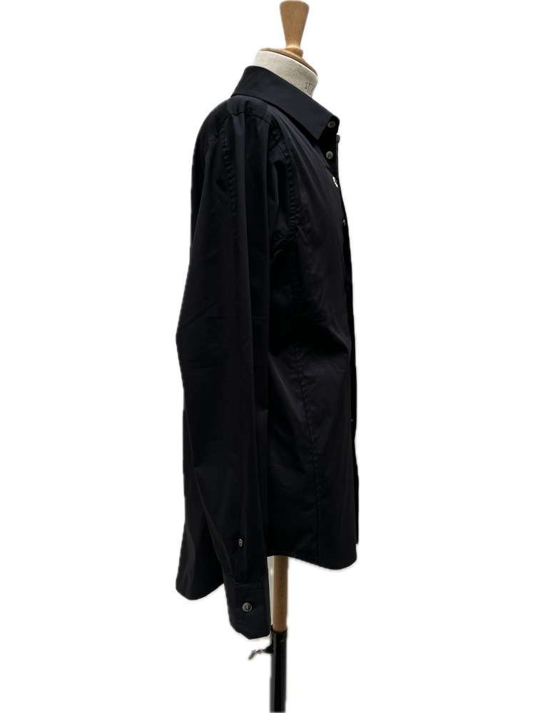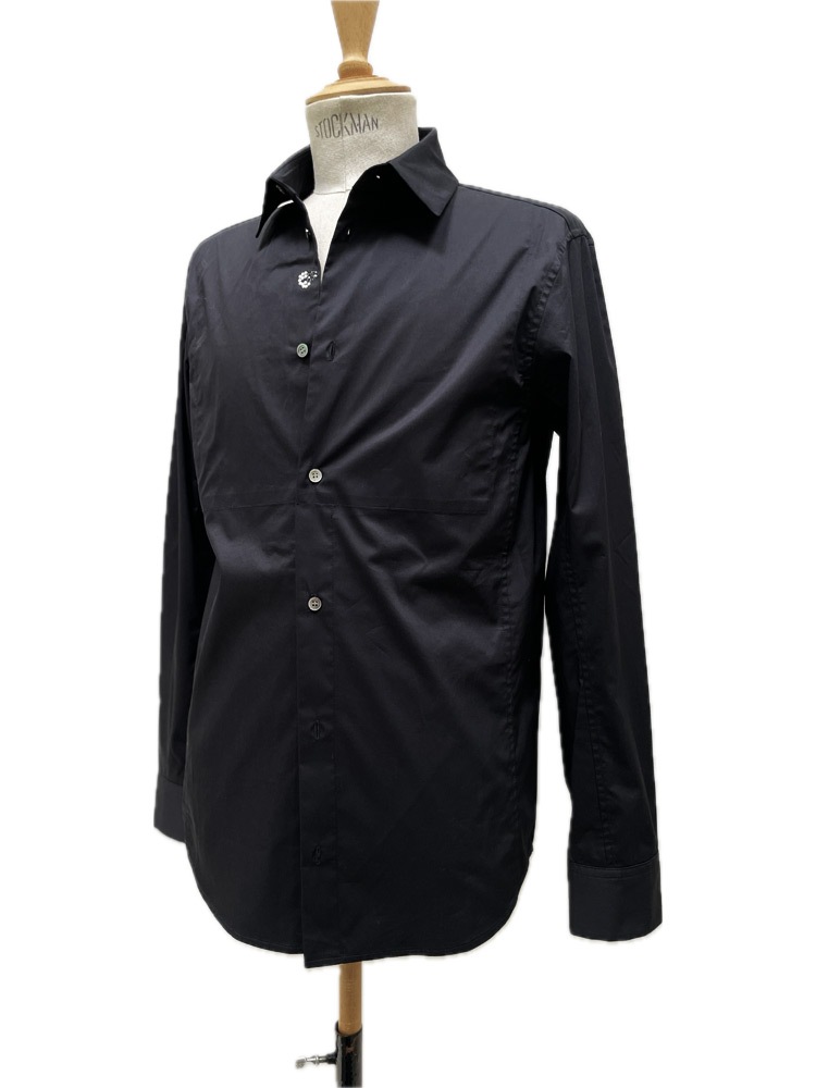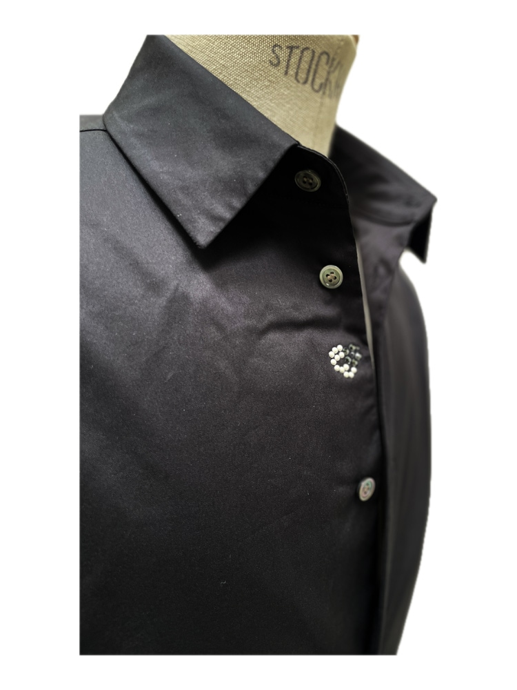 一見シンプルでシルエットが美しいドレスシャツかと思いきや、第1、第22ボタンを外すと、前立てには、フランシスト・モークスの象徴 『HiBiSkull:ハイビスカル』 最新モチーフ:パール&ラインストーンが 輝く、真骨頂のデザイン。