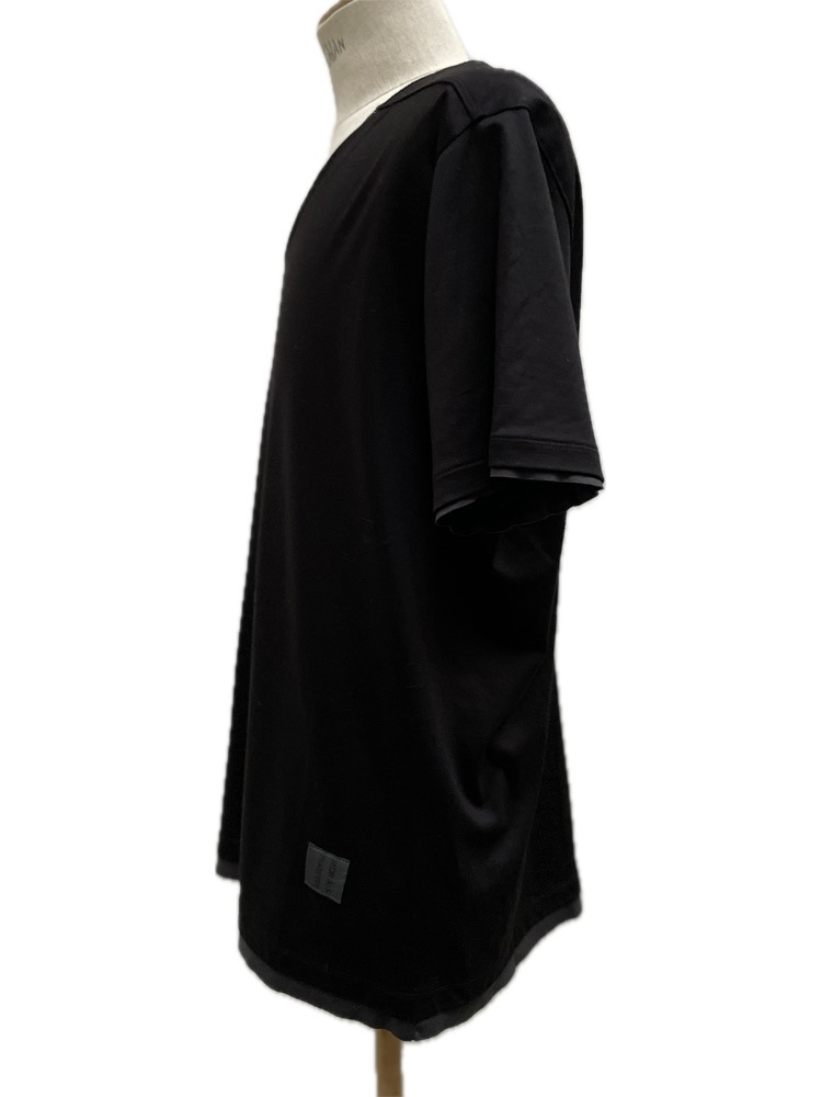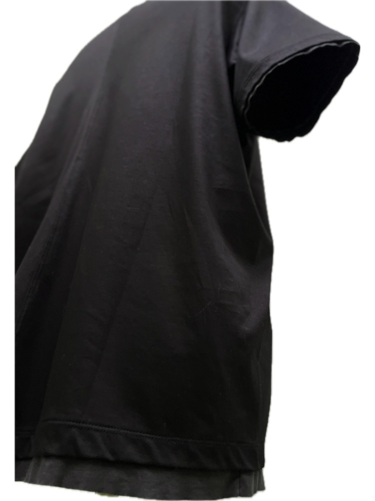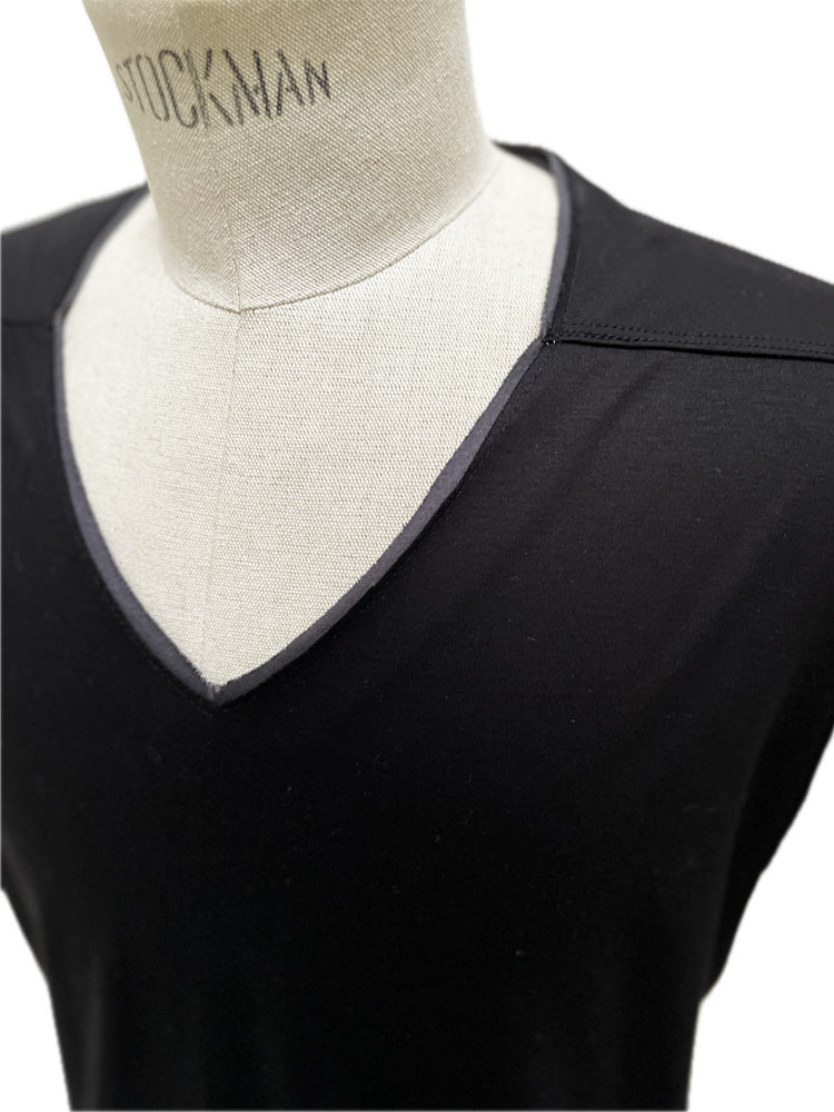 モークスの真骨頂のひとつ【フェイクレイヤードVネック】が追加されました。 巷でよく見るフェイクレイヤーとは一線を画し、裁ち切りパーツを、まるでTシャツ2枚重ねしているかの様に作り込んで見せる、ネック、袖口、そして裾パーツのフェイクレイヤードの仕様テクニックが素敵で贅沢な作品。