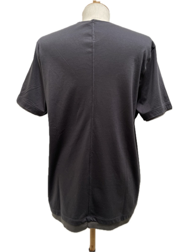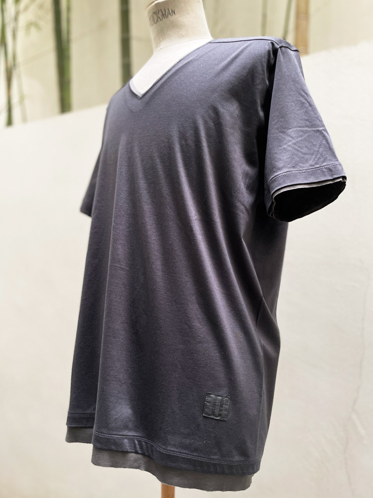 モークスの真骨頂のひとつ【フェイクレイヤードVネック】が追加されました。 巷でよく見るフェイクレイヤーとは一線を画し、裁ち切りパーツを、まるでTシャツ2枚重ねしているかの様に作り込んで見せる、ネック、袖口、そして裾パーツのフェイクレイヤードの仕様テクニックが素敵で贅沢な作品。
