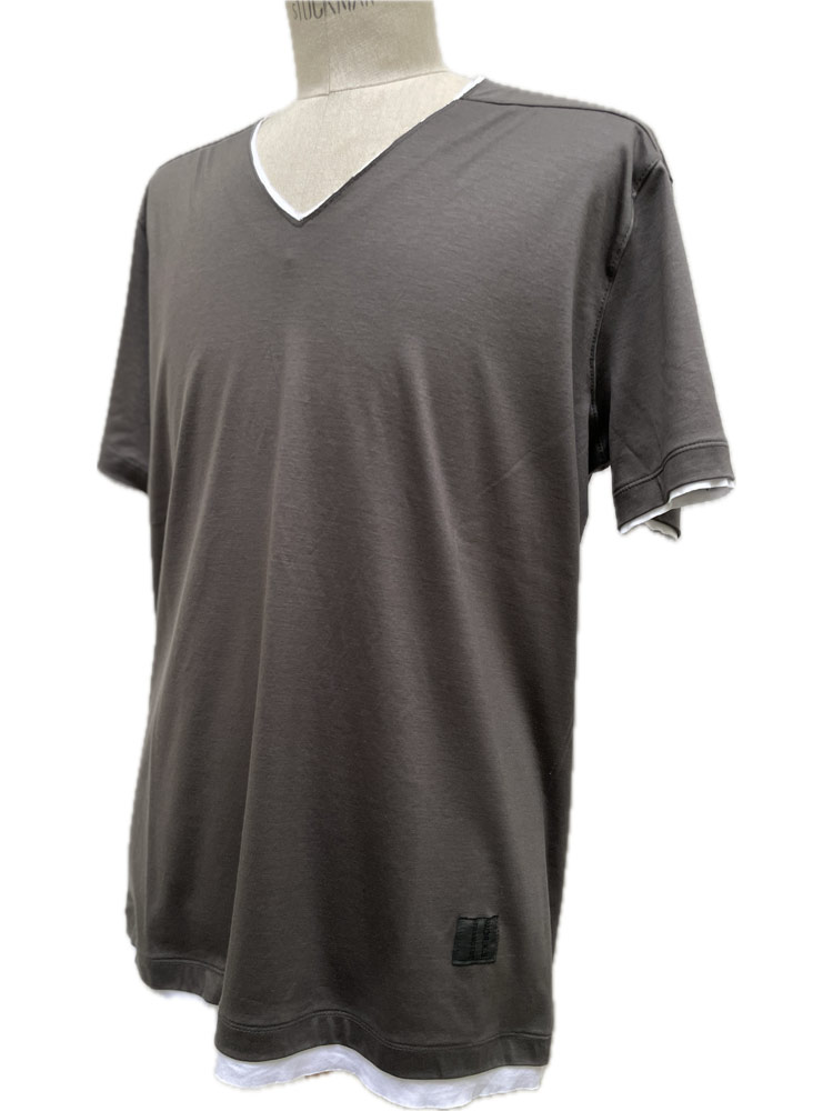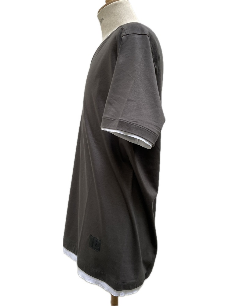 モークスの真骨頂のひとつ【フェイクレイヤードVネック】が追加されました。 巷でよく見るフェイクレイヤーとは一線を画し、裁ち切りパーツを、まるでTシャツ2枚重ねしているかの様に作り込んで見せる、ネック、袖口、そして裾パーツのフェイクレイヤードの仕様テクニックが素敵で贅沢な作品。