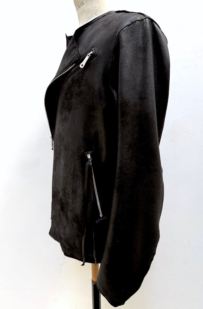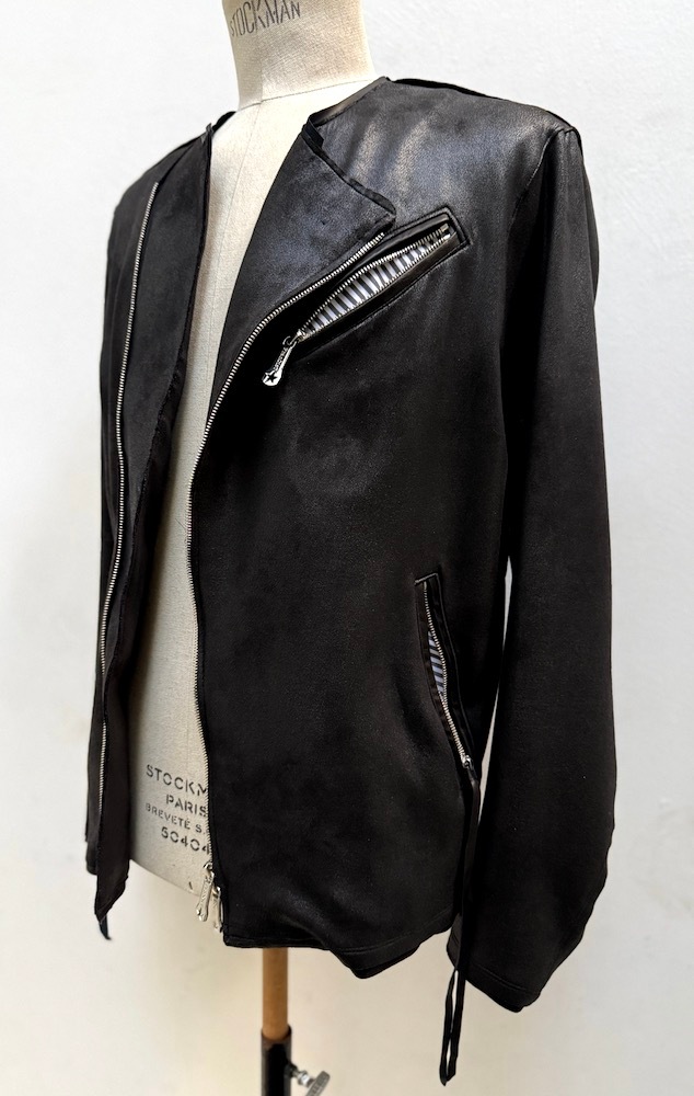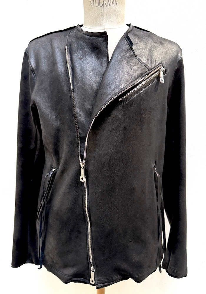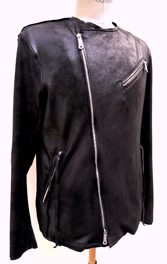 通年着用可能な、10オンス4WAYストレッチ・エコスエードに透明箔加工を施し、リアルレザーの質感と抜群のストレッチ性を持ち合わせた、ライトオンス・ハイテンション エコレザーをベースに、本革ラムレザーを(衿周り, 後ろ衿見返し,ポケット両玉縁の切替パーツ)贅沢に採用した、新作”ハイブリッドノーカラー・ライダースジャケット。